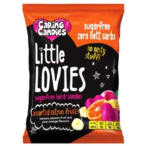 These 100g Sugarfree Little Lovies Assorted Citrus Fruits flavoured candies from Caring Candies are free from all ‘Nasty Stuff’, which means no sugar, no fat, no artificial sweeteners, no artificial colourants, no artificial flavourants, no artificial preservatives, no common food allergens so no dairy, no eggs, no gluten, no tree nuts, no peanuts, no soy, no yeast, no MSG, no Tartrazine. They contain ZERO Nett or Glycaemic Carbs, are Tooth-Friendly, Kosher Pareve, And Halaal Certified. Suitable for Vegans, Diabetics, those with ADD/ADHD, the Health Conscious, and those following a Banting, or low carb lifestyle.