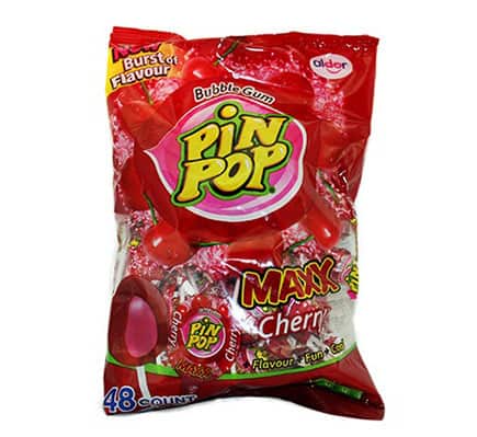 Cherry flavoured lollipop with a grape flavoured bubblegum center.